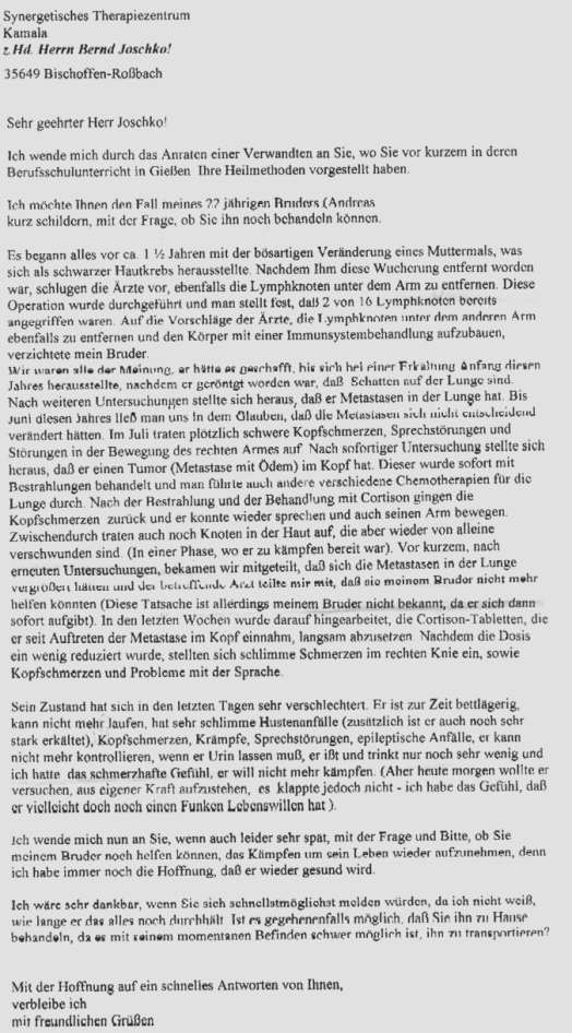 B. Joschko Einzelsitzung mit Jürgen S., 22 Jahre, Krebs im Endzustand, Probesitzung vom 19.11.95 am Krankenbett zu Hause bei seinen Eltern.